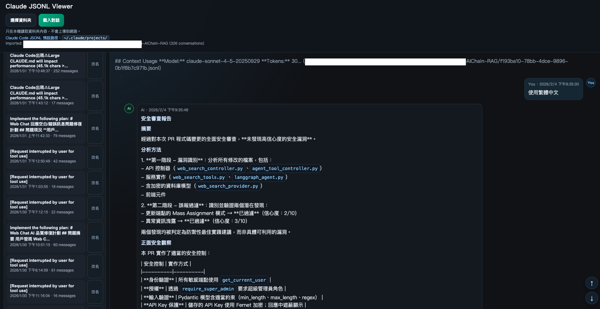 但 context window 的限制讓這些紀錄在「當下使用」時就被丟棄了。Claude JSONL Viewer 做的事情很簡單:把這些已經存在但難以存取的紀錄,用一個人類友善的方式呈現出來。